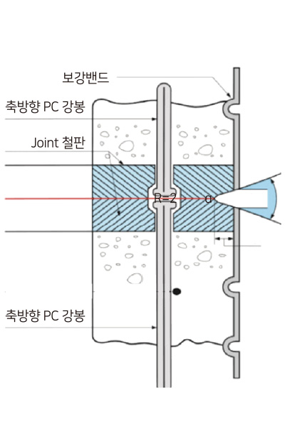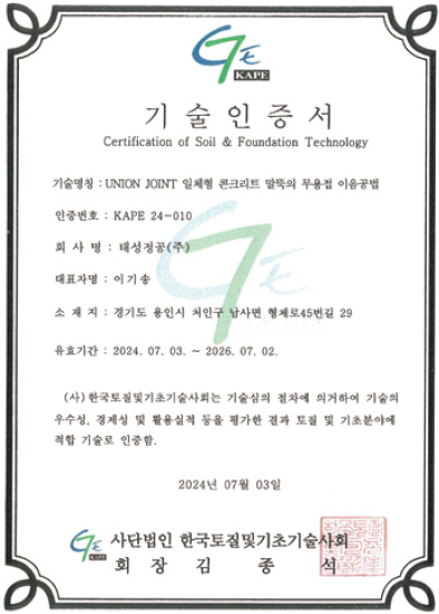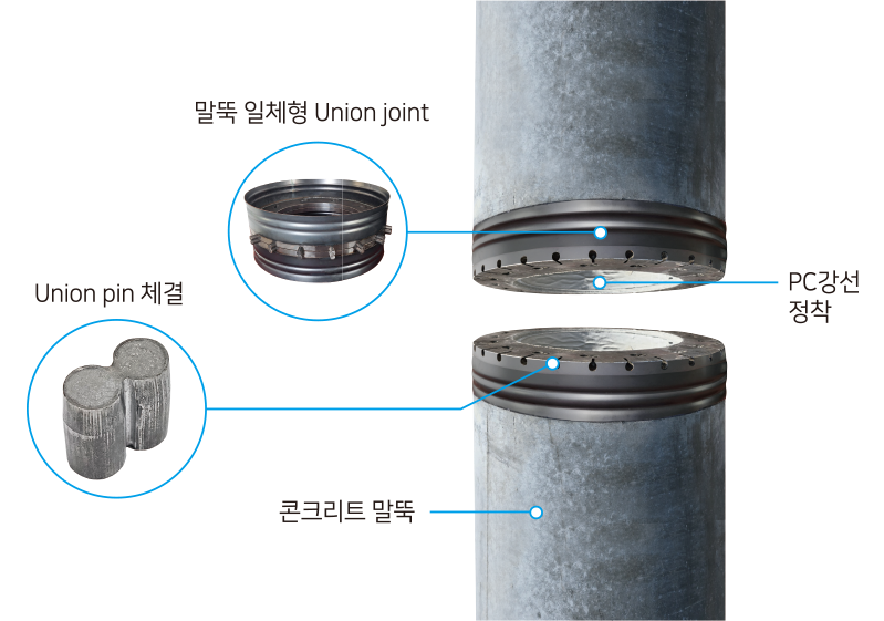 말뚝 일체형 Joint(KS F 4306규정 : 이음부용 철물에 강선의 끝부가 장착되도록 한 조인트)가 부착된 상하부 말뚝을 말뚝 제조사에서 생산하여, 현장에서 일체형 Union pin을 1회 수평 조립하는 Smart 무용접·무볼트 이음 공법